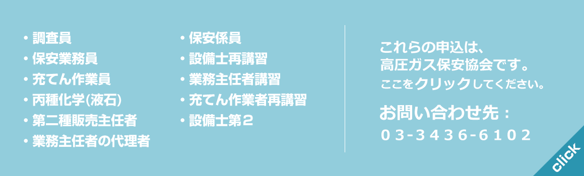 - 丙種化学(夜石)・第二種販売主任者・保安係員講習は、インターネット(東京の高圧ガス保安協会)による申込ができます。なお、従来どおり当教育事務所での申込もできます。